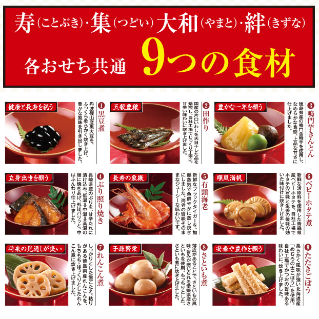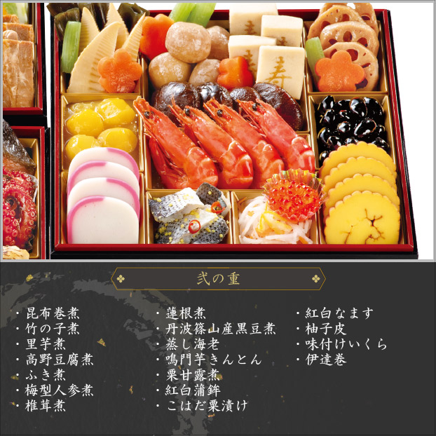 昆布巻煮、竹の子煮、里芋煮、高野豆腐煮、ふき煮、梅型人参煮、椎茸煮、蓮根煮、丹波篠山産黒豆煮、蒸し海老、鳴門芋きんとん、栗甘露煮、紅白蒲鉾、こはだ粟漬け、紅白なます、柚子皮、味付けいくら、伊達巻