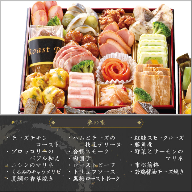 チーズチキンロースト、ブロッコリーのバジル和え、ニシンのマリネ、くるみのキャラメリゼ、真鯛の香草焼き、ハムとチーズの枝豆テリーヌ、合鴨スモーク、肉団子、ローストビーフ、トリュフソース、黒糖ローストポーク、紅鮭スモークローズ、豚角煮、野菜とサーモンのマリネ、市松蒲鉾、若鶏醤油チーズ焼き