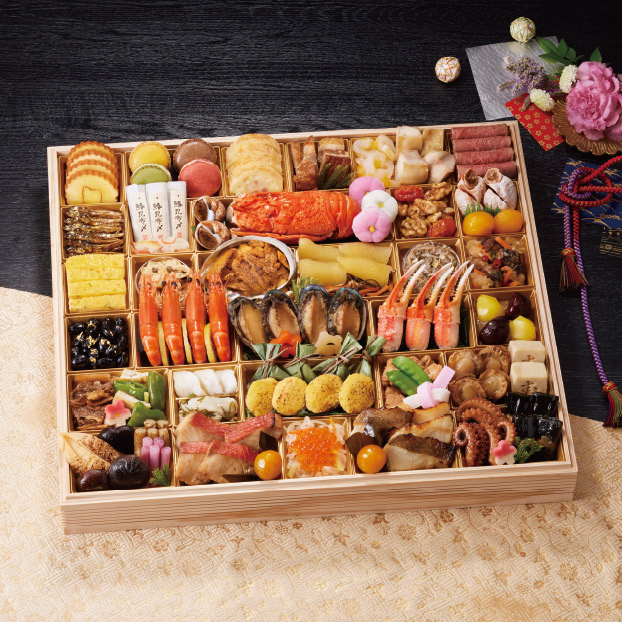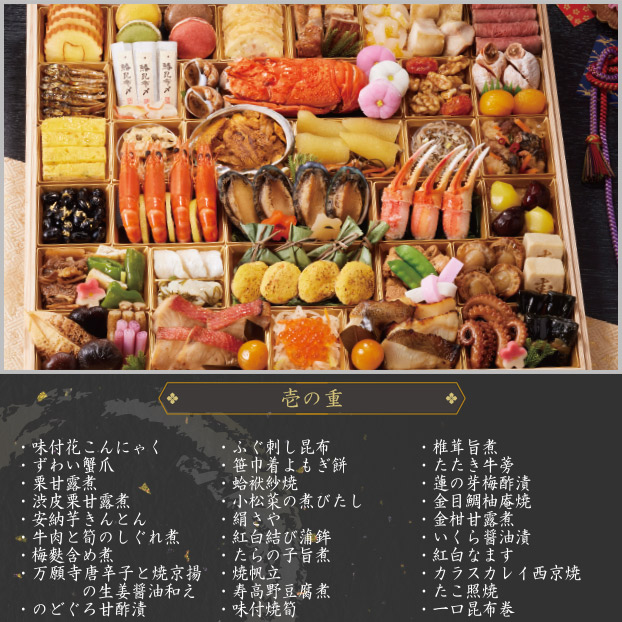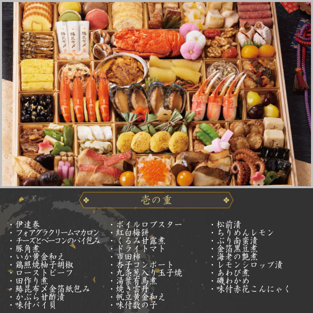 伊達巻、フォアグラクリームマカロン、チーズとベーコンのパイ包み、豚角煮、いか黄金和え、鶏照焼柚子胡椒、ローストビーフ、田作り煮、鰆昆布〆金箔紙包み、かぶら甘酢漬、味付バイ貝、ボイルロブスター、紅白梅餅、くるみ甘露煮、ドライトマト、市田柿、杏子コンポート、九条葱入り玉子焼、湯葉有馬煮、焼き雲丹、帆立黄金和え、味付数の子、松前漬、ちりめんレモン、ぶり南蛮漬、金箔黒豆煮、海老の艶煮、レモンシロップ漬、あわび煮、磯わかめ、味付赤花こんにゃく、味付花こんにゃく、ずわい蟹爪、栗甘露煮、渋皮栗甘露煮、安納芋きんとん、牛肉と筍のしぐれ煮、梅麩含め煮、万願寺唐辛子と焼京揚の生姜醤油和え、のどぐろ甘酢漬、ふぐ刺し昆布、笹巾着よもぎ餅、蛤袱紗焼、小松菜の煮びたし、絹さや、紅白結び蒲鉾、たらの子旨煮、焼帆立、寿高野豆腐煮、味付焼筍、椎茸旨煮、たたき牛蒡、蓮の芽梅酢漬、金目鯛柚庵焼、金柑甘露煮、いくら醤油漬、紅白なます、カラスカレイ西京焼、たこ照焼、一口昆布巻
