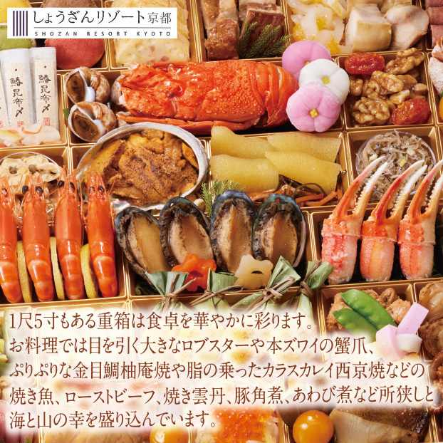 1尺5寸もある重箱は食卓を華やかに彩ります。お料理では目を引く大きなロブスターや本ズワイの蟹爪、ぷりぷりな金目鯛柚庵焼や脂の乗ったカラスカレイ西京焼などの焼き魚、ローストビーフ、焼き雲丹、豚角煮、あわび煮など所狭しと海と山の幸を盛り込んでいます。