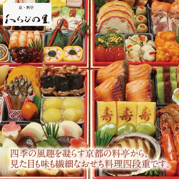四季の風趣を凝らす京都の料亭から、見た目も味も繊細なおせち料理四段重です。