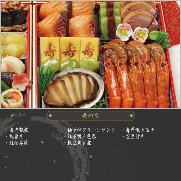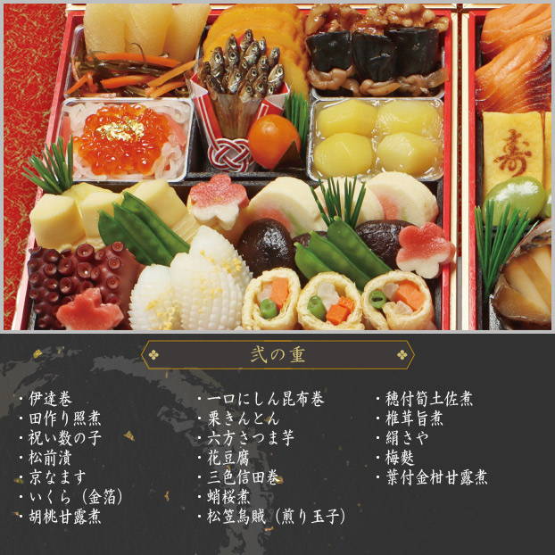 伊達巻、田作り照煮、祝い数の子、松前漬、京なます、いくら(金箔)、胡桃甘露煮、一口にしん昆布巻、栗きんとん、六方さつま芋、花豆腐、三色信田巻、蛸桜煮、松笠烏賊(煎り玉子)、穂付筍土佐煮、椎茸旨煮、絹さや、梅麩、葉付金柑甘露煮