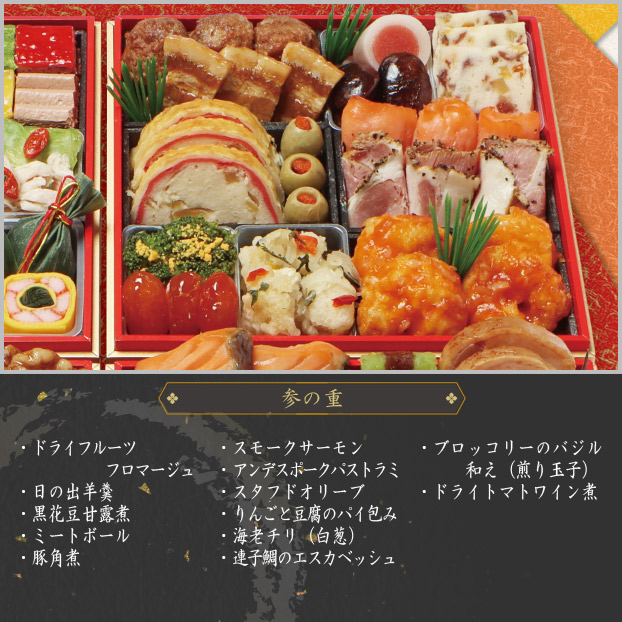 ドライフルーツフロマージュ、日の出羊羹、黒花豆甘露煮、ミートボール、豚角煮、スモークサーモン、アンデスポークパストラミ、スタフドオリーブ、りんごと豆腐のパイ包み、海老チリ(白葱)、連子鯛のエスカベッシュ、ブロッコリーのバジル和え(煎り玉子)、ドライトマトワイン煮