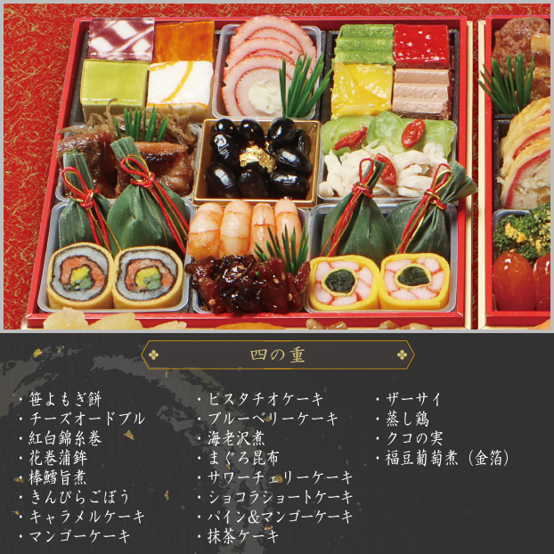笹よもぎ餅、チーズオードブル、紅白錦糸巻、花巻蒲鉾、棒鱈旨煮、きんぴらごぼう、キャラメルケーキ、マンゴーケーキ、ピスタチオケーキ、ブルーベリーケーキ、海老沢煮、まぐろ昆布、サワーチェリーケーキ、ショコラショートケーキ、パイン&マンゴーケーキ、抹茶ケーキ、ザーサイ、蒸し鶏、クコの実、福豆葡萄煮(金箔)
