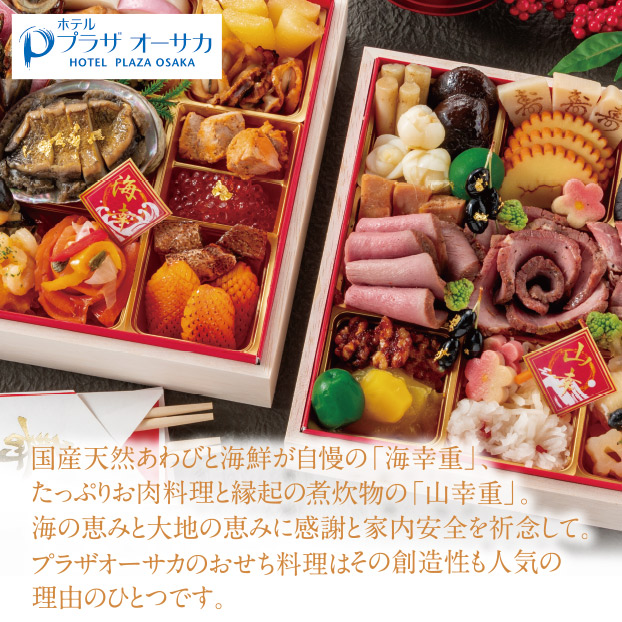 国産天然あわびと海鮮が自慢の「海幸重」、たっぷりお肉料理と縁起の煮炊物の「山幸重」。海の恵みと大地の恵みに感謝と家内安全を祈念して。プラザオーサカのおせち料理はその創造性も人気の理由のひとつです。
