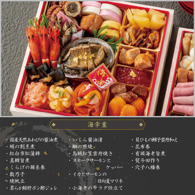 国産天然あわびの醤油煮、蛸の割烹煮、紅白市松蒲鉾、真鱈旨煮、くらげの錦糸巻、数乃子、焼帆立、柔らか鮟肝ポン酢ジュレ、いくら醤油漬、鰤の照焼、烏賊松笠雲丹焼き、スモークサーモンとケッパー、イカとサーモンの日向夏マリネ、小海老のサラダ仕立て、貝ひもの鱈子雲丹和え、昆布巻、有頭海老旨煮、熨斗田作り、穴子八幡巻