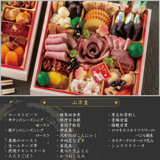 ローストビーフ、牛タンのシーズニングロースト、豚タンのシーズニングロースト、栗豚のロースト、生ハムチーズ串、照焼チキンステーキ、たたきごぼう、椎茸田舎煮、牡丹百合根、寿羽子板筍、伊達巻、花形紅白こんにゃく、日向夏なます、菊花蕪、栗入りきんとん、かつおくるみ、黒豆松葉刺し、青梅甘露、梅麩甘煮、ロマネスコカリフラワーのバジル風味、賽の目カットのローストビーフ、カスタードのオーロラ包み、ショコラテリーヌ