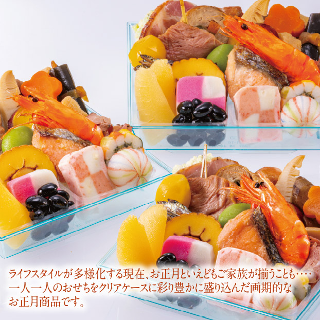 ライフスタイルが多様化する現在、お正月といえどもご家族が揃うことも・・・・一人一人のおせちをクリアケースに彩り豊かに盛り込んだ画期的なお正月商品です。また、お正月の人が集う状況で、個別に提供することもできます。ご家族でも、お客様のおもてなしにもいろいろな食シーンで、活用できる食べきりサイズです。