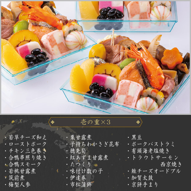 若草チーズ和え、ローストポーク、チキン三色巻き、合鴨串照り焼き、合鴨スモーク、若桃甘露煮、筑前煮、梅型人参、栗甘露煮、子持ちわかさぎ昆布、穂先筍、紅あずま甘露煮、たつくり、味付け数の子、伊達巻、市松蒲鉾、黒豆、ポークパストラミ、有頭海老塩焼き、トラウトサーモン西京焼き、鮭チーズオードブル、加賀太鼓、京餅手まり(×3)