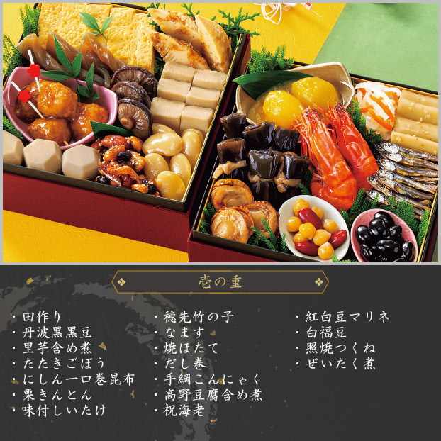 田作り、丹波黒黒豆、里芋含め煮たたきごぼう、にしん一口巻昆布栗きんとん、味付しいたけ、穂先竹の子なます、焼ほたて、だし巻手綱こんにゃく、高野豆腐含め煮祝海老、紅白豆マリネ白福豆、照焼つくね、ぜいたく煮