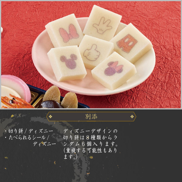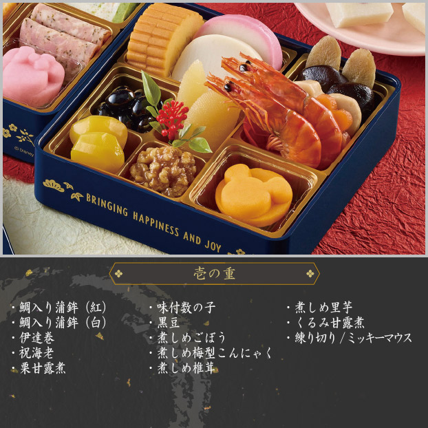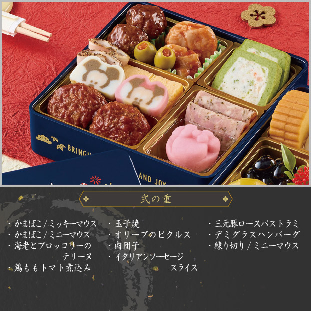 鯛入り蒲鉾(紅)、鯛入り蒲鉾(白)、伊達巻、祝海老、栗甘露煮、味付数の子、黒豆、煮しめごぼう、煮しめ梅型こんにゃく、煮しめ椎茸、煮しめ里芋、くるみ甘露煮、練り切り/ミッキー