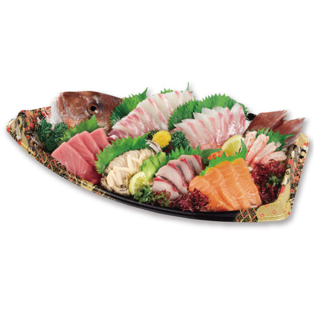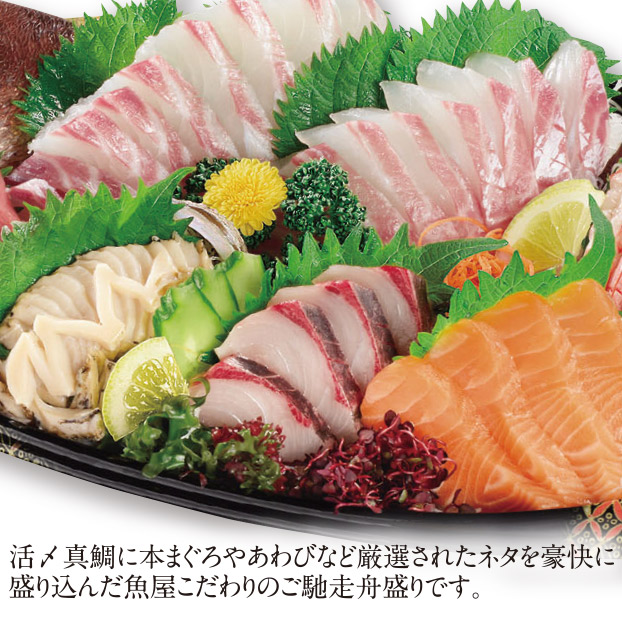 活〆真鯛に本まぐろやあわびなど厳選されたネタを豪快に盛り込んだ魚屋こだわりのご馳走舟盛りです。