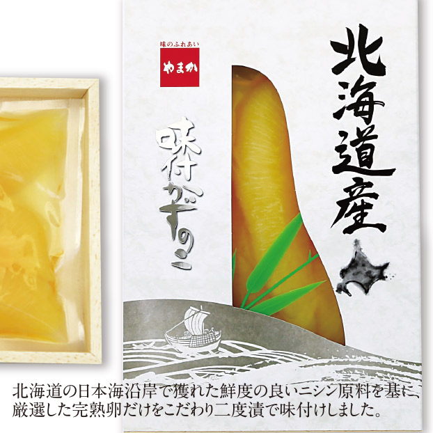 北海道の日本海沿岸で獲れた鮮度の良いニシン原料を基に、厳選した完熟卵だけをこだわり二度漬で味付けしました。