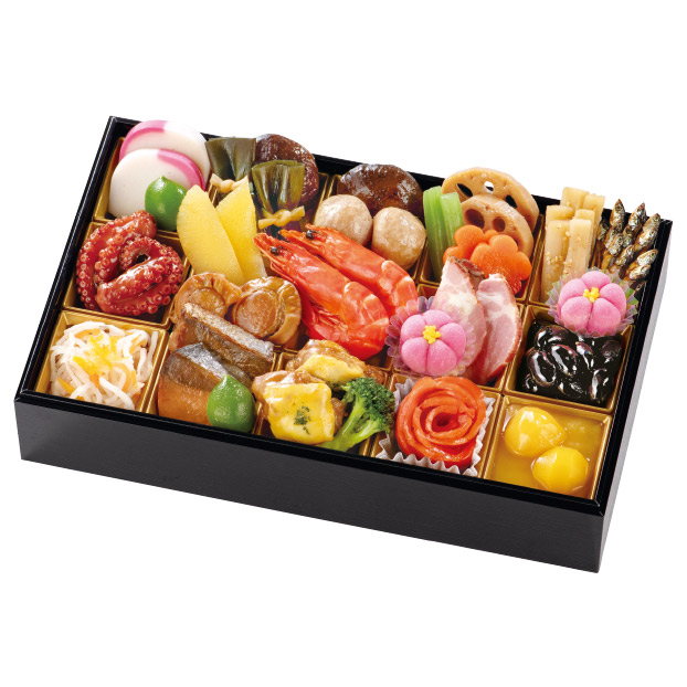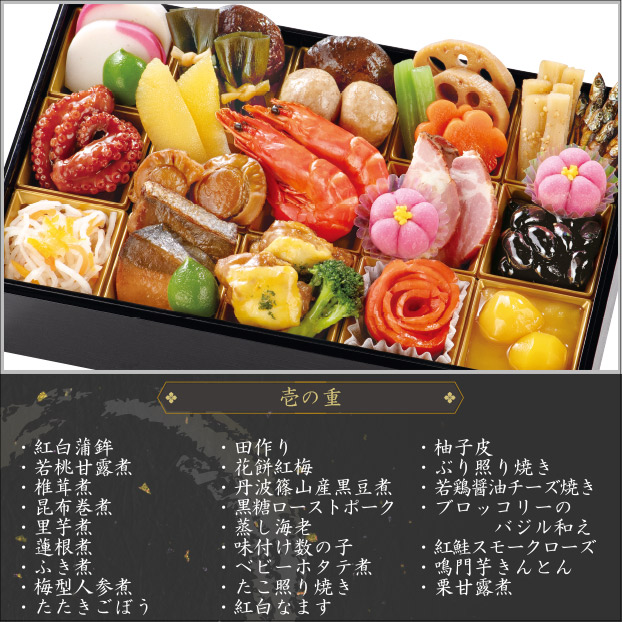 紅白蒲鉾、若桃甘露煮、椎茸煮、昆布巻煮、里芋煮、蓮根煮、ふき煮、梅型人参煮、たたきごぼう、田作り、花餅紅梅、丹波篠山産黒豆煮、黒糖ローストポーク、蒸し海老、味付け数の子、ベビーホタテ煮、たこ照り焼き、紅白なます、柚子皮、ぶり照り焼き、若鶏?油チーズ焼き、ブロッコリーのバジル和え、紅鮭スモークローズ、鳴門芋きんとん、栗甘露煮