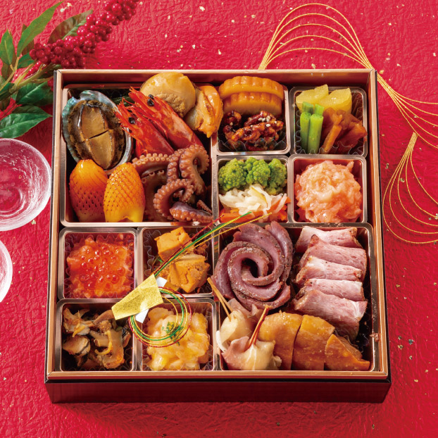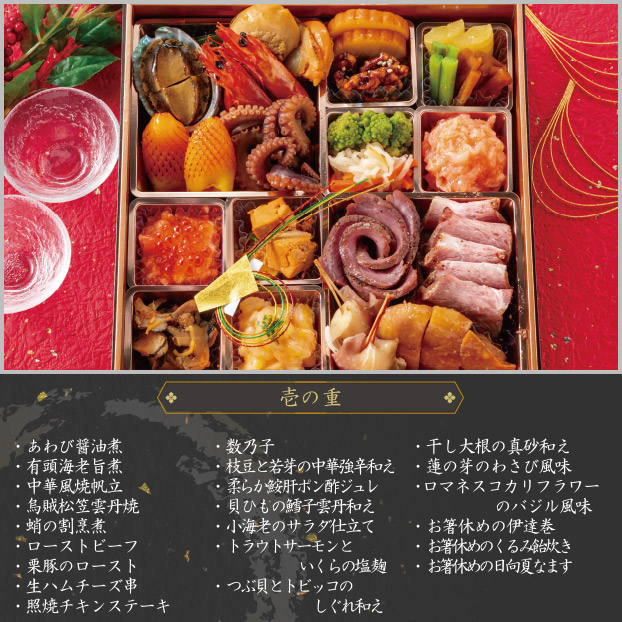 あわび醤油煮、有頭海老旨煮、中華風焼帆立、烏賊松笠雲丹焼、蛸の割烹煮、ローストビーフ、栗豚のロースト、生ハムチーズ串、照焼チキンステーキ、数乃子、枝豆と若芽の中華強辛和え、柔らか鮟肝ポン酢ジュレ、貝ひもの鱈子雲丹和え、小海老のサラダ仕立て、トラウトサーモンといくらの塩?、つぶ貝とトビッコのしぐれ和え、干し大根の真砂和え、蓮の芽のわさび風味、ロマネスコカリフラワーのバジル風味、お箸休めの伊達巻、お箸休めのくるみ飴炊き、お箸休めの日向夏なます
