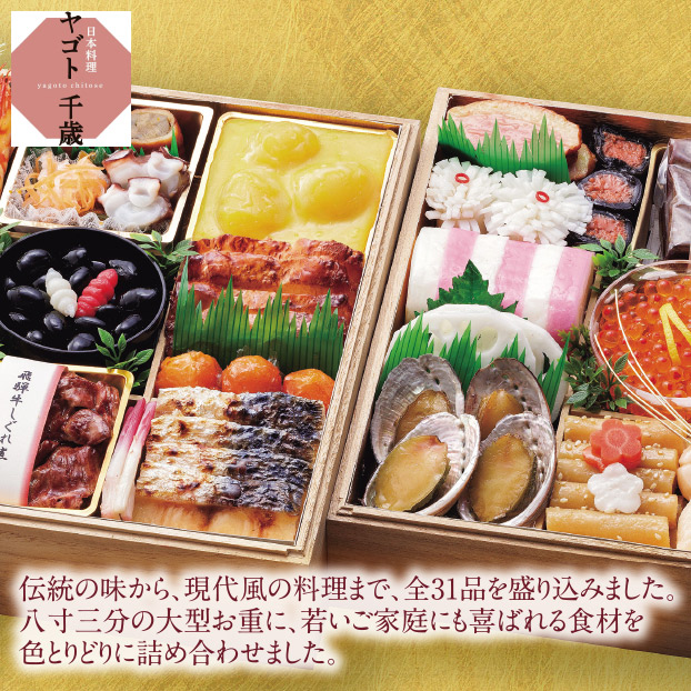 伝統の味から、現代風の料理まで、全31品を盛り込みました。味付けについての特徴・こだわり八寸三分の大型お重に、若いご家庭にも喜ばれる食材を色とりどりに詰め合わせました。