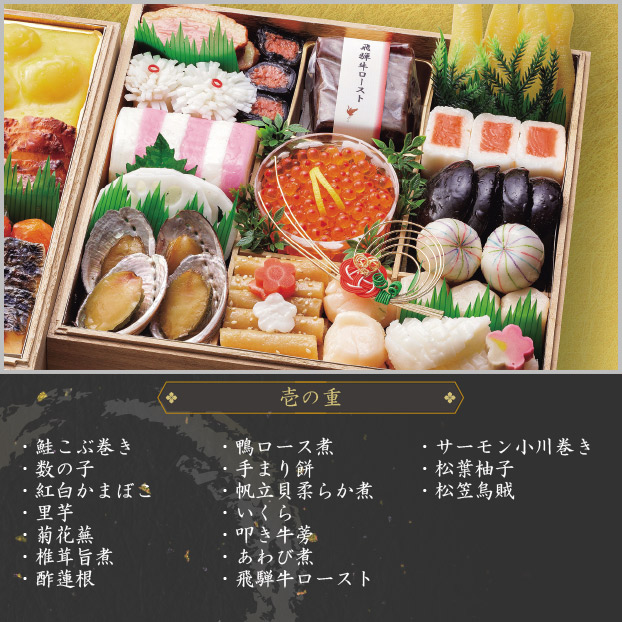 鮭こぶ巻き、数の子、紅白かまぼこ、里芋、菊花蕪、椎茸旨煮、酢蓮根、鴨ロース煮、手まり餅、帆立貝柔らか煮、いくら、叩き牛蒡、あわび煮、飛騨牛ロースト、サーモン小川巻き、松葉柚子、松笠烏賊