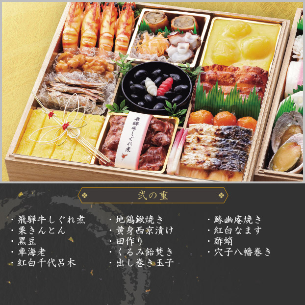 飛騨牛しぐれ煮、栗きんとん、黒豆、車海老、紅白千代呂木、地鶏鍬焼き、黄身西京漬け、田作り、くるみ飴焚き、出し巻き玉子、鰆幽庵焼き、紅白なます、酢蛸、穴子八幡巻き