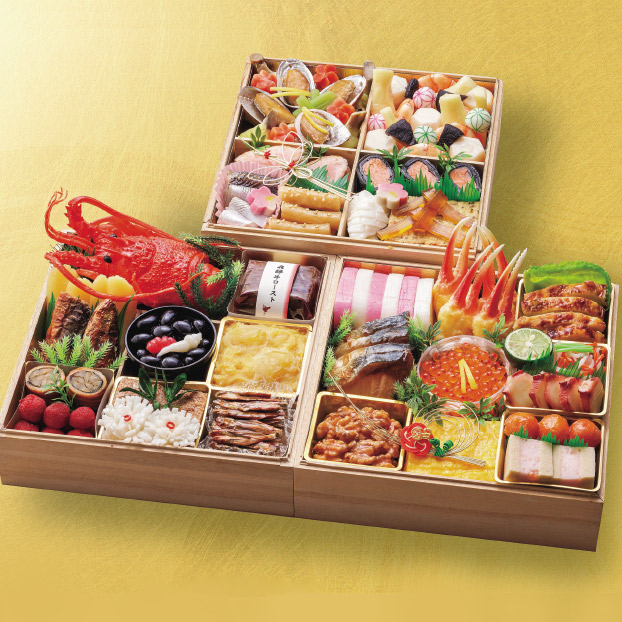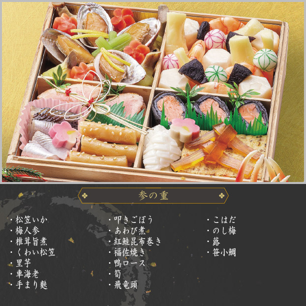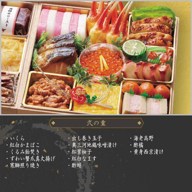 いくら、紅白かまぼこ、くるみ飴焚き、ずわい蟹爪真丈揚げ、寒鰤照り焼き、出し巻き玉子、奥三河地鶏味噌漬け、松葉柚子、紅白なます、酢蛸、海老高野、酢橘、黄身西京漬け