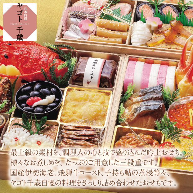 最上級の素材を、調理人の心と技で盛り込んだ吟上おせち。様々なお煮しめを、たっぷりご用意した三段重です。味付けについての特徴・こだわり国産伊勢海老、飛騨牛ロースト、子持ち鮎の煮浸等々、ヤゴト千歳自慢の料理をぎっしり詰め合わせたおせちです。