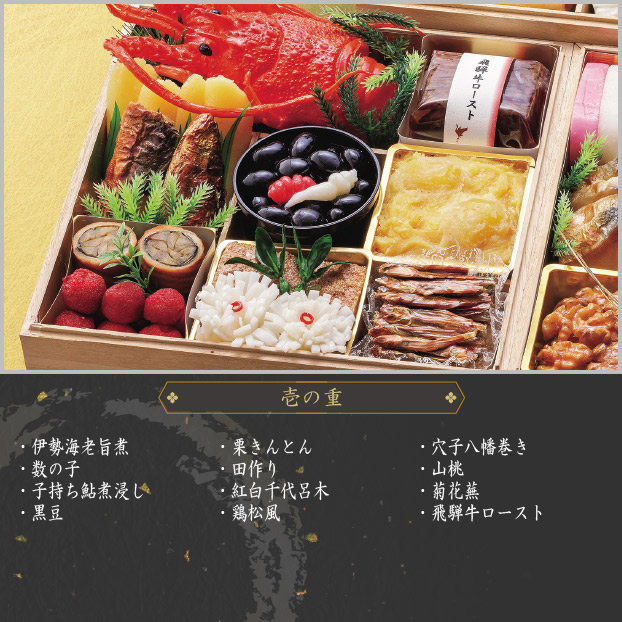 伊勢海老旨煮、数の子、子持ち鮎煮浸し、黒豆、栗きんとん、田作り、紅白千代呂木、鶏松風、穴子八幡巻き、山桃、菊花蕪、飛騨牛ロースト