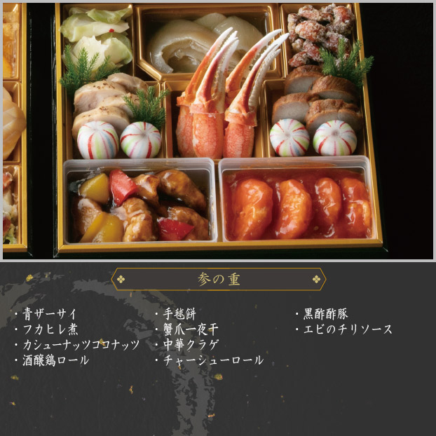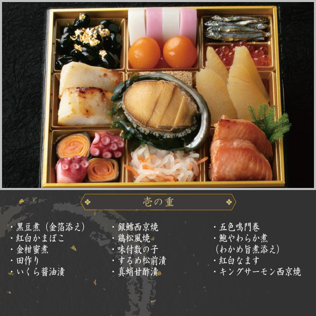 黒豆煮(金箔添え)、紅白かまぼこ、金柑蜜煮、田作り、いくら醤油漬、銀鱈西京焼、鶏松風焼、味付数の子、するめ松前漬、真蛸甘酢漬、五色鳴門巻、鮑やわらか煮(わかめ旨煮添え)、紅白なます、キングサーモン西京焼