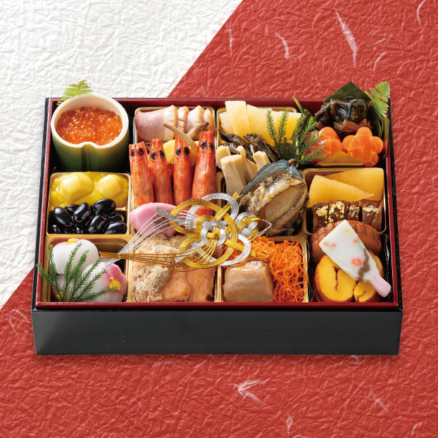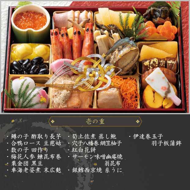 鱒の子酢取り長芋、合鴨ロース豆慈姑、数の子田作り、梅花人参鰊昆布巻、栗金団黒豆、車海老姿煮末広麩、筍土佐煮蒸し鮑、穴子八幡巻網笠柚子、紅白花餅、サーモン味噌幽庵焼翁昆布、銀鱈西京焼糸うに、伊達巻玉子羽子板蒲鉾