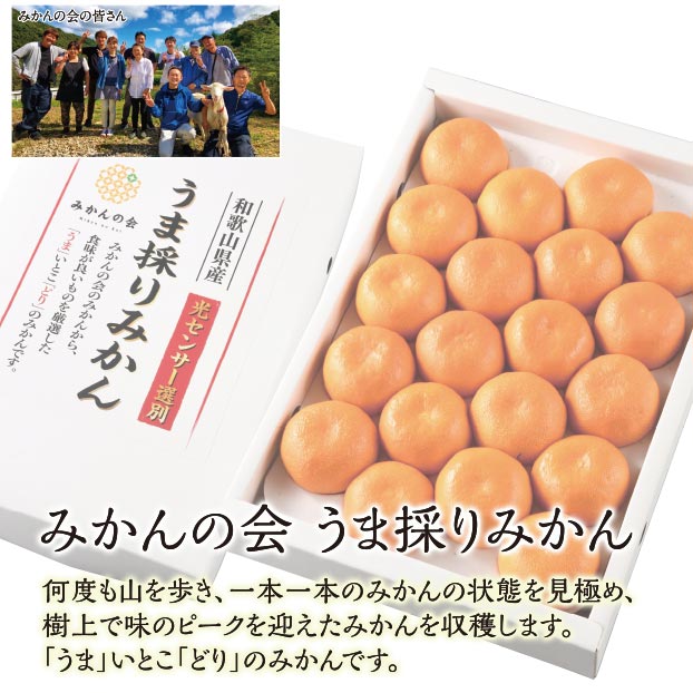 何度も山を歩き、一本一本のみかんの状態を見極め、樹上で味のピークを迎えたみかんを収穫します。「うま」いとこ「どり」のみかんです。