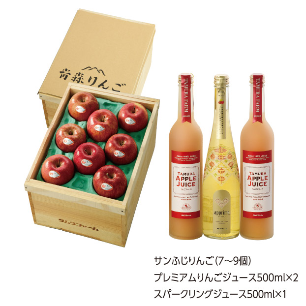 - ※サンふじりんご(7~9個)、プレミアムりんごジュース500ml×2、スパークリングジュース500ml×1