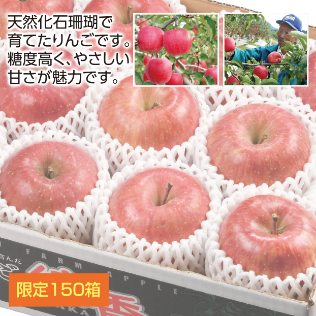 天然化石珊瑚で育てたりんごです。糖度高く、やさしい甘さが魅力です。(限定150箱)