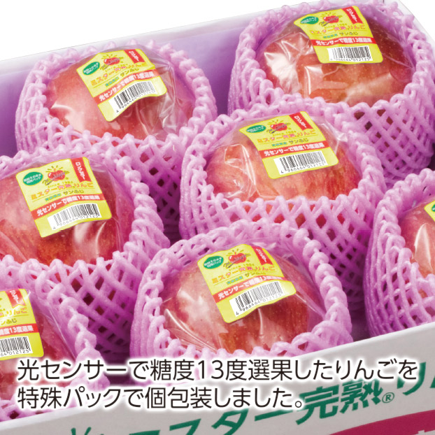 光センサーで糖度13度選果したりんごを特殊パックで個包装しました。