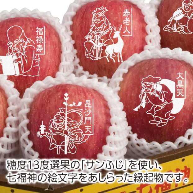 糖度13度選果の「サンふじ」を使い、七福神の絵文字をあしらった縁起物です。
