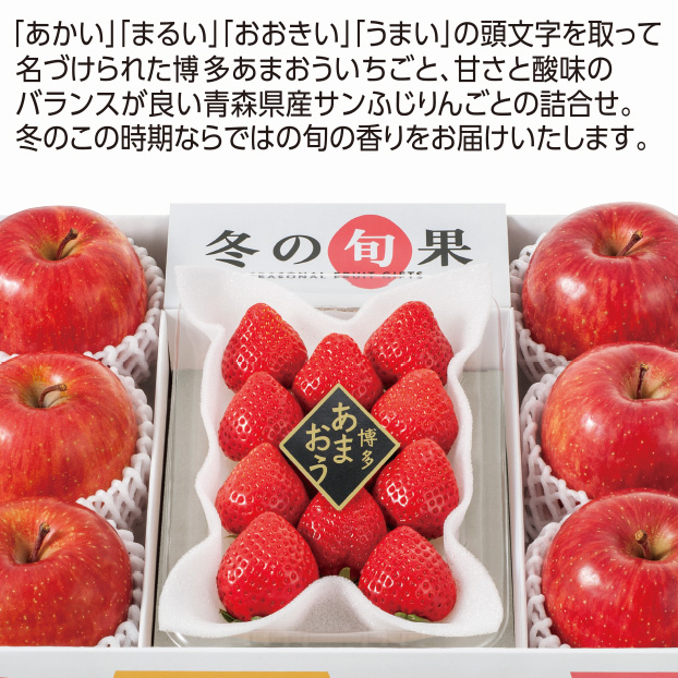 「あかい」「まるい」「おおきい」「うまい」の頭文字を取って名づけられた博多あまおういちごと、甘さと酸味のバランスが良い青森県産サンふじりんごとの詰合せ。冬のこの時期ならではの旬の香りをお届けいたします。