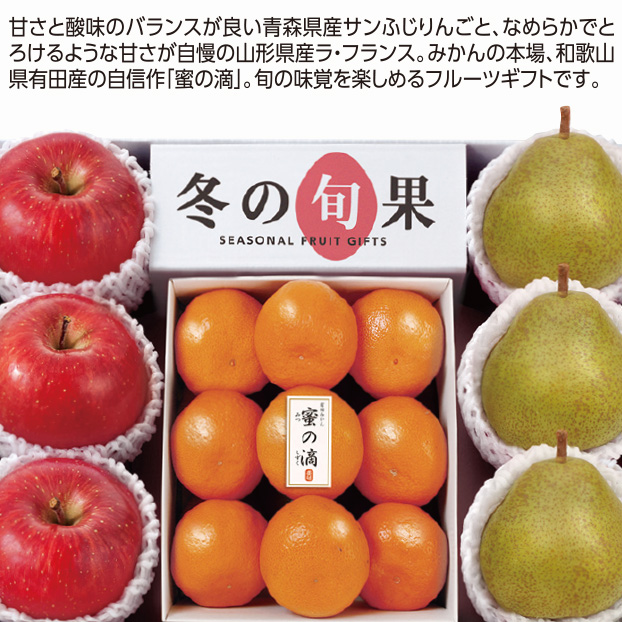 甘さと酸味のバランスが良い青森県産サンふじりんごと、なめらかでとろけるような甘さが自慢の山形県産ラ・フランス。みかんの本場、和歌山県有田産の自信作「蜜の滴」。旬の味覚を楽しめるフルーツギフトです。