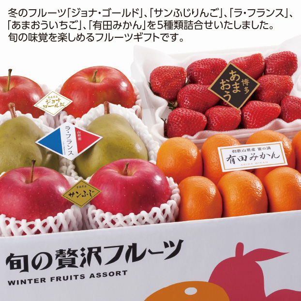 冬のフルーツ「ジョナ・ゴールド」、「サンふじりんご」、「ラ・フランス」、「あまおういちご」、「有田みかん」を5種類詰合せいたしました。旬の味覚を楽しめるフルーツギフトです。