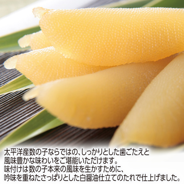 太平洋産数の子ならではの、しっかりとした歯ごたえと風味豊かな味わいをご堪能いただけます。味付けは数の子本来の風味を生かすために、吟味を重ねたさっぱりとした白醤油仕立てのたれで仕上げました。