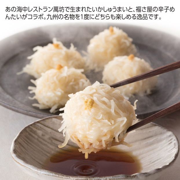 あの海中レストラン萬坊で生まれたいかしゅうまいと、福さ屋の辛子めんたいがコラボ。九州の名物を1度にどちらも楽しめる逸品です。