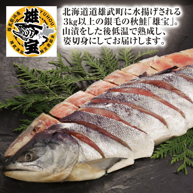 北海道雄武町に水揚げされる3㎏以上の銀毛の秋鮭「雄宝」。山漬をした後低温で熟成し、姿切身にしてお届けします。