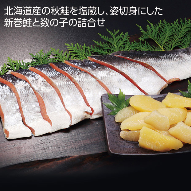 北海道産の秋鮭を塩蔵し、姿切身にした新巻鮭と数の子の詰合せ