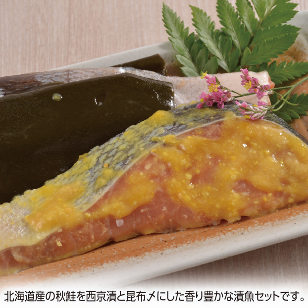 北海道産の秋鮭を西京漬と昆布〆にした香り豊かな漬魚セットです。