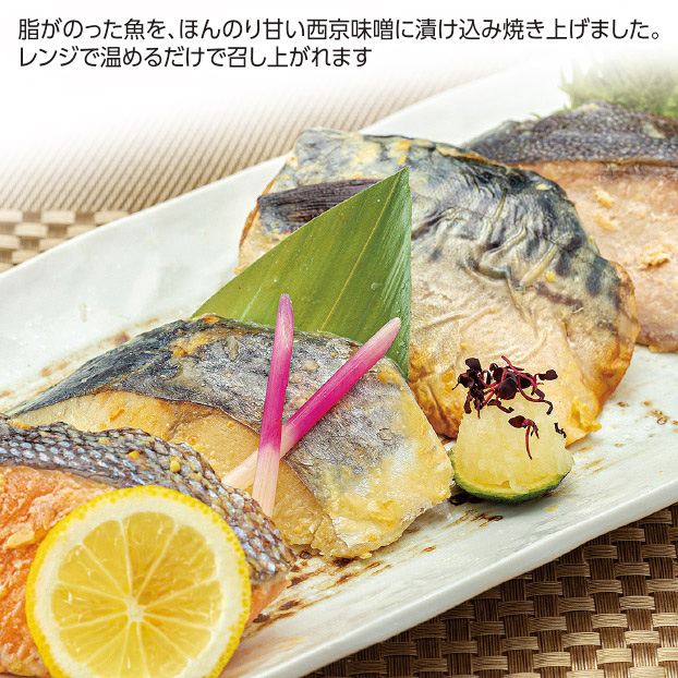 脂がのった魚を、ほんのり甘い西京味噌に漬け込み焼き上げました。レンジで温めるだけで召し上がれます