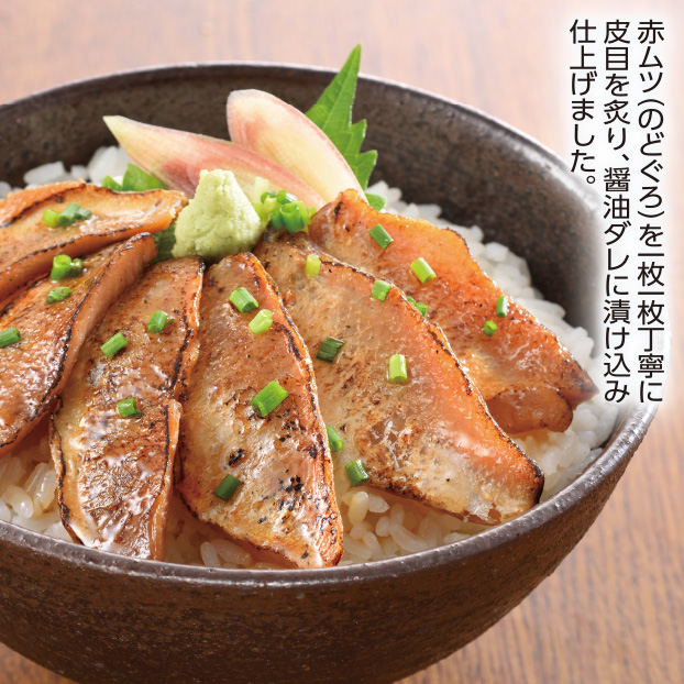 赤ムツ(のどぐろ)を一枚一枚丁寧に皮目を炙り、醤油ダレに漬け込み仕上げました。