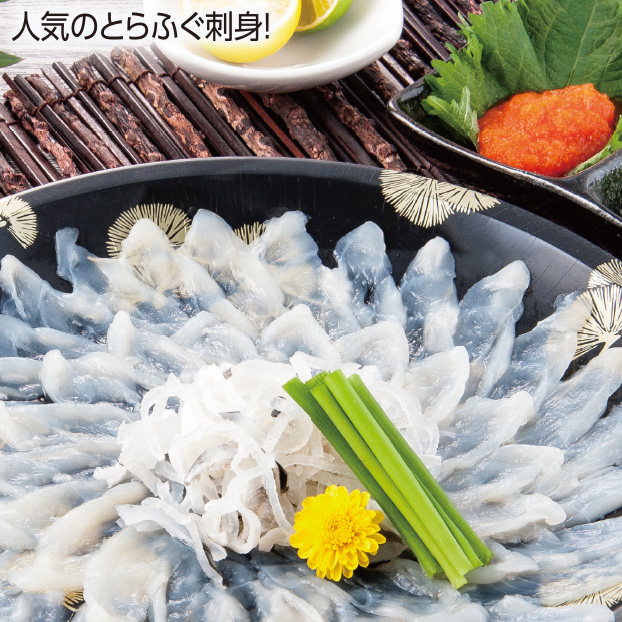 - ※とらふぐ刺身70g(25cm皿)、とらふぐ皮湯引き40g、ぽん酢10g×4個、紅葉卸し2.5g×4個、産地:とらふぐ(長崎県産養殖)