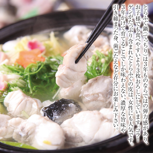 とらふぐ鍋(てっちり)は3年ものならではの弾力感があり、お子様でも食べやすいよう3枚おろしにしています。コラーゲンがたっぷり含まれたとらふぐの皮は、女性にも人気です。3年かけて育てることでしか味わえない、濃厚な旨味や引き締まった身、歯ごたえなど存分にお楽しみ下さい。