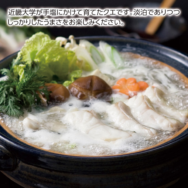近畿大学が手塩にかけて育てたクエです。淡泊でありつつしっかりしたうまさをお楽しみください。
