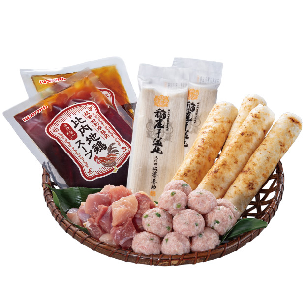 - ※比内地鶏200g、比内地鶏入り生つくね140g、比内地鶏スープ200g×2、きりたんぽ140g(2本入り)×2、稲庭うどん(乾麺)80g×2