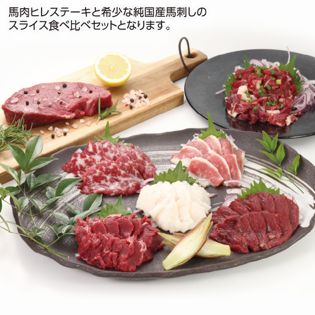 馬肉ヒレステーキと希少な純国産馬刺しのスライス食べ比べセットとなります。