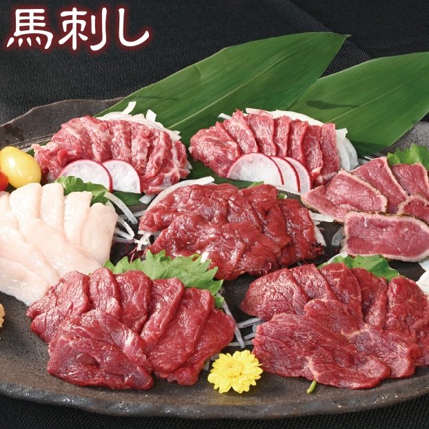 - ※赤身馬刺し70g×2、桜ロース70g×1、鶏タタキ70g×1、馬肉タタキ70g×1、桜納豆用馬刺し100g×1、馬肉ハンバーグ150g×2、馬刺し専用醤油150ml×1、ギフト箱付き