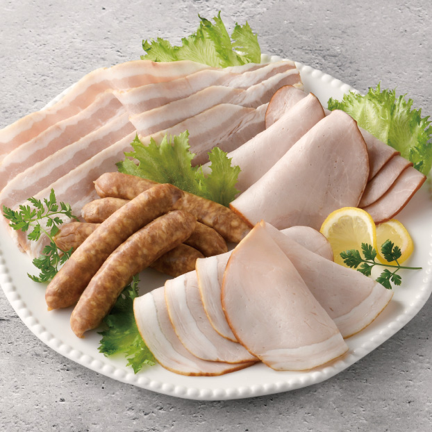 - ※ロースハム(スライス)59g、ベーコン(スライス)61g、ボンレスハム(スライス)59g、荒挽きソーセージ90g 各1パック