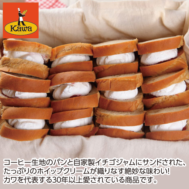 コーヒー生地のパンと自家製イチゴジャムにサンドされた、たっぷりのホイップクリームが織りなす絶妙な味わい!カワを代表する30年以上愛されている商品です。